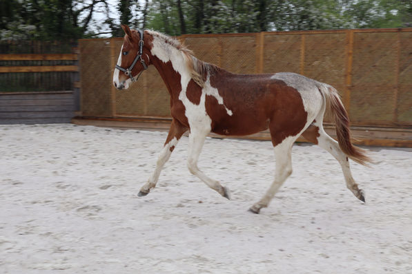 Il est un des plus originaux que l'on ai fait naître! Pie Alezan homozygote avec les yeux bleus! Quel robe somptueuse pour ce fils de Tineke qui une fois de plus nous donne de l'homozygote! Il possède de belles allures, de l'équilibre et un look unique!!